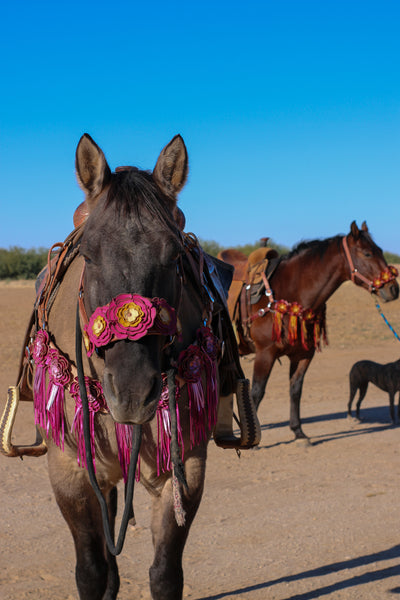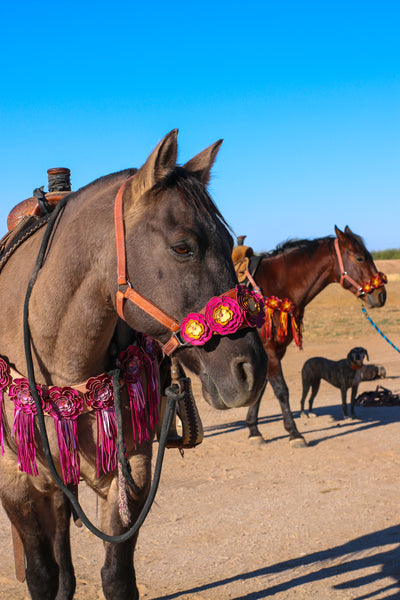 Herman Oak leather bronc halter from Martin Saddlery with our Signature leather flowers attached with heavy duty rivets!